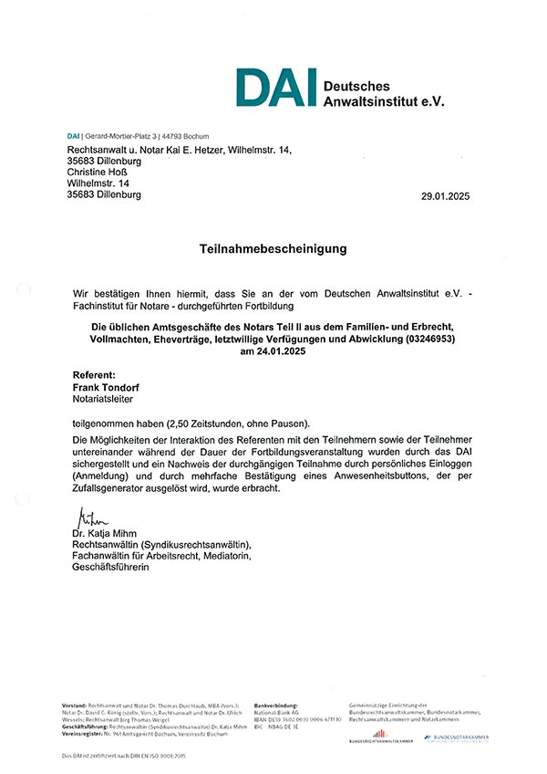 „Familien- und Erbrecht, Vollmachten, Eheverträge, letztwillige Verfügungen und Abwicklung“